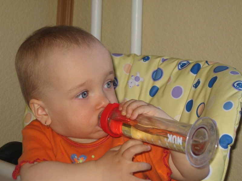 А мы неделю назад серьги поменяли :) Поорали,конечно для приличия... но вот так это теперь выглядит : З.Ы. Не подумайте,что мы ре бутылку с соской даем,просто в шкафу нашли,решили посмеяться, присосалась,хотя до года плевала и орала! :) Больше не дам,а то понравится ещё,не отучу потом :)