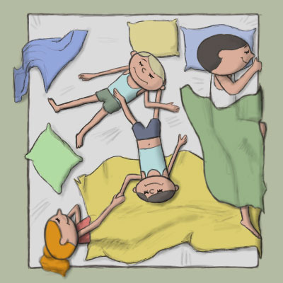 Мы днем спим отдельно (сын в кроватке), а вечером с мамой и папой. Спит как на картинках, которые cimeries показывала. Ничего все привыкли Нашему папе конечно с утра достается, если сын проснулся, а папа спит (а он всегда спит), то сын ползет к нему и начинает по лицу, спине ладошкой стучать и хохотать =) "мол просыпайся. давай играть" Муж тогда повернется к нему лицо, даст ему цепочку с крестиком и еще минут 20 может доспать =)